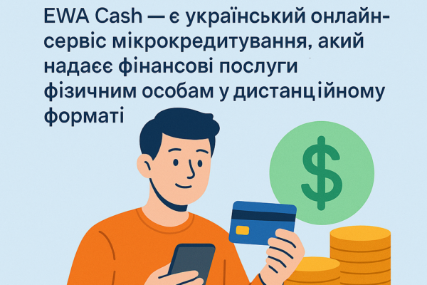 EWA Cash – український онлайн-сервіс мікрокредитування для фізичних осіб. Отримайте короткостроковий кредит без відвідування офісу, прямо на свою банківську картку.