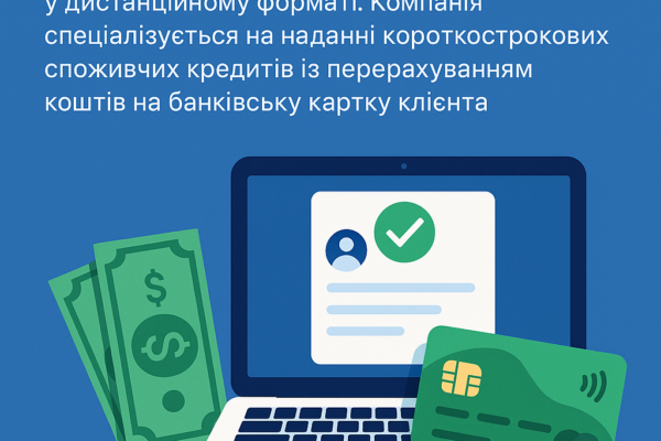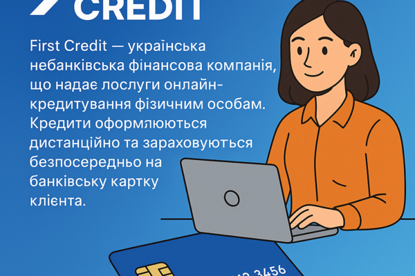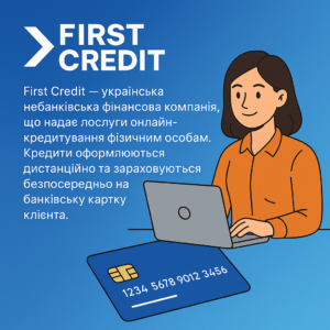 First Credit – українська небанківська компанія, що надає онлайн-кредити фізичним особам. Оформлення кредитів відбувається онлайн, з грошима на картку.