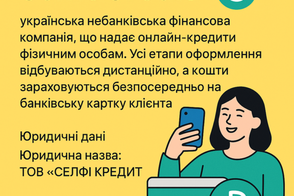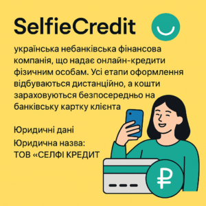 SelfieCredit – українська компанія, що надає онлайн-кредити. Оформлення кредиту відбувається онлайн, кошти зараховуються на банківську картку.